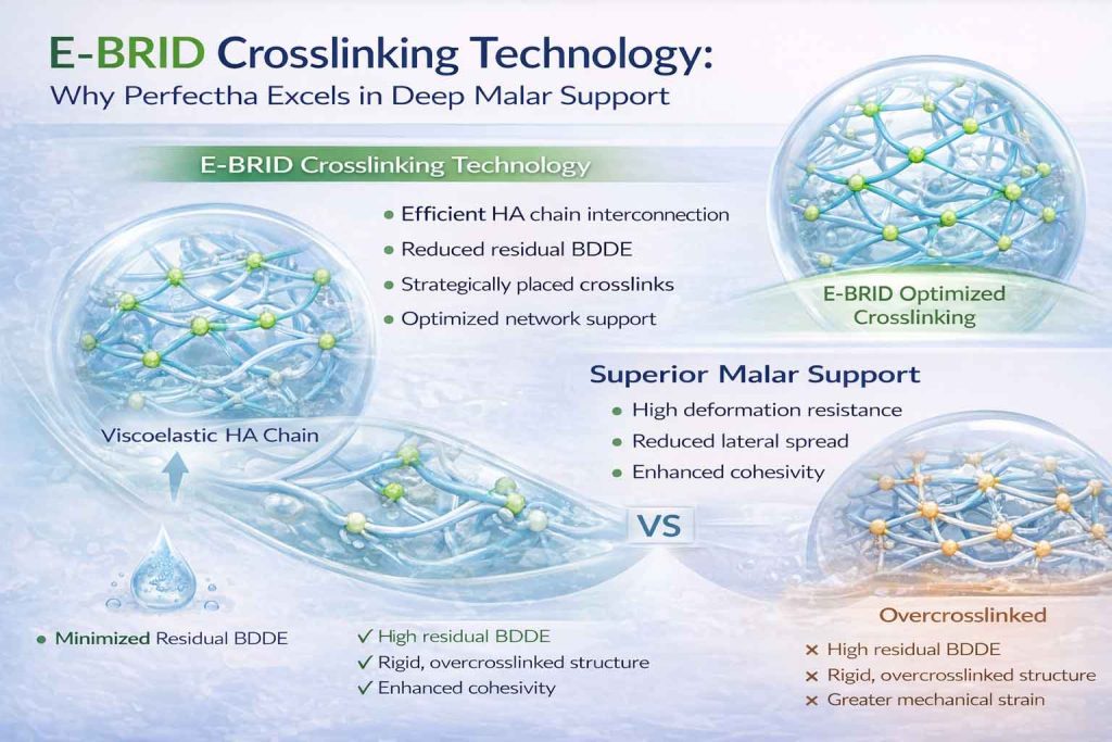 In this context, the discussion around Perfectha and its E-BRID crosslinking technology becomes particularly relevant. Unlike more widely marketed technologies, E-BRID focuses on structural efficiency rather than excessive crosslinking, allowing strong deep malar support with lower residual BDDE.